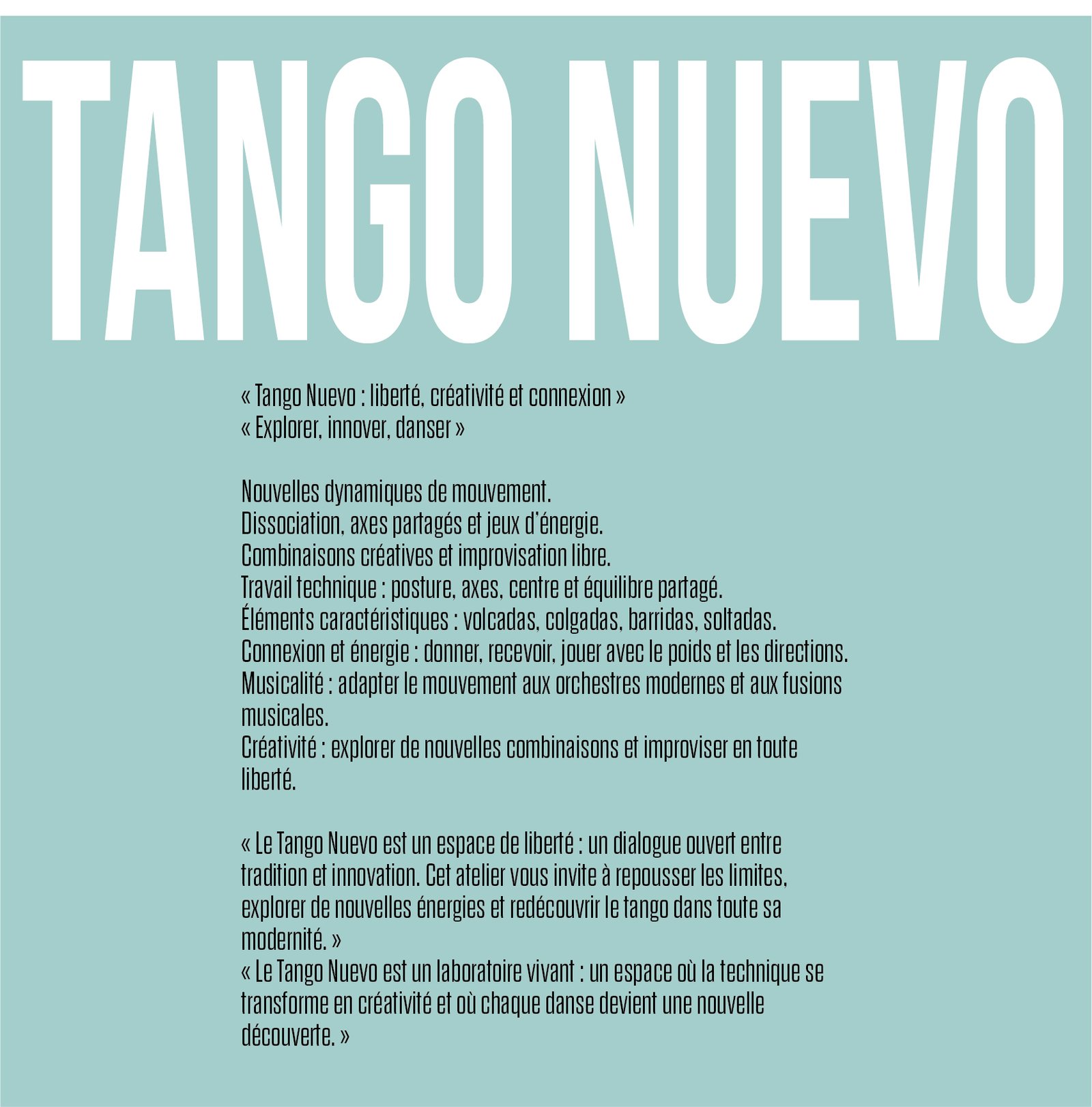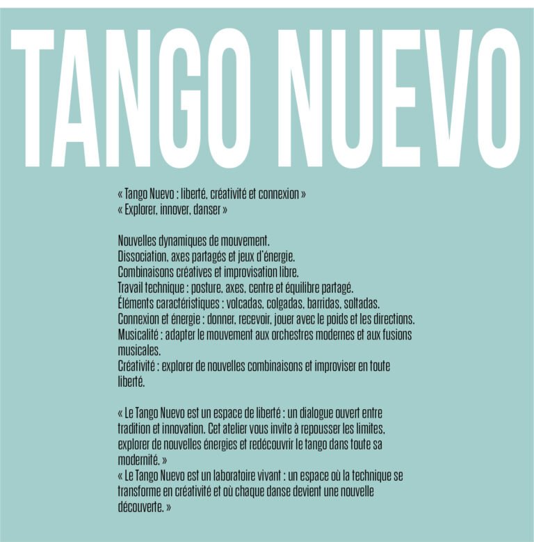 Vous pouvez faire un cours d’essai durant l’année, que vous veniez faire votre premier pas ou que vous vouliez vous enrichir votre tango avec la technique de Andrea PONZETTI, vous êtes les bienvenus.